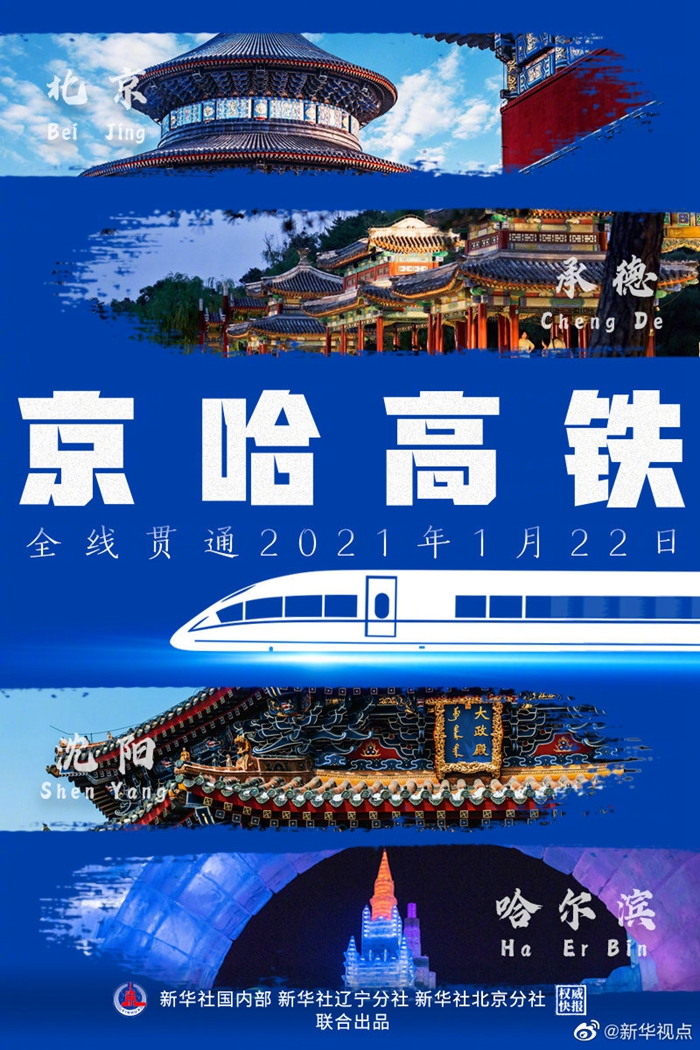 新华社北京1月21日电(记者樊曦、丁静、徐扬)记者从中国国家铁路集团有限公司获悉,北京至哈尔滨高铁北京至承德段(京哈高铁京承段)将于2021年1月22日开通运营,京哈高铁实现全线贯通,北京至沈阳、哈尔滨最快2小时44分、4小时52分可达。
