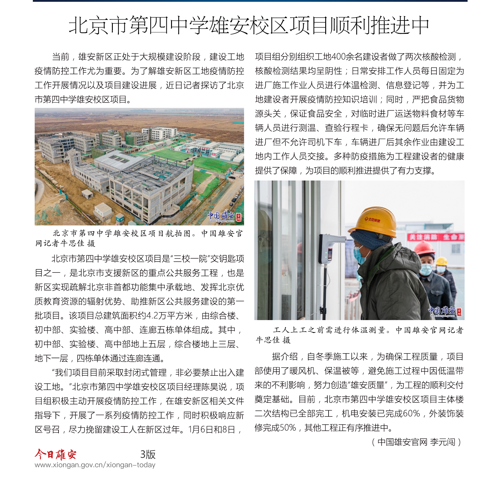目前,北京市第四中学雄安校区项目主体楼二次结构已全部完工,机电安装已完成60%,外装饰装修完成50%,其他工程正有序推进中。