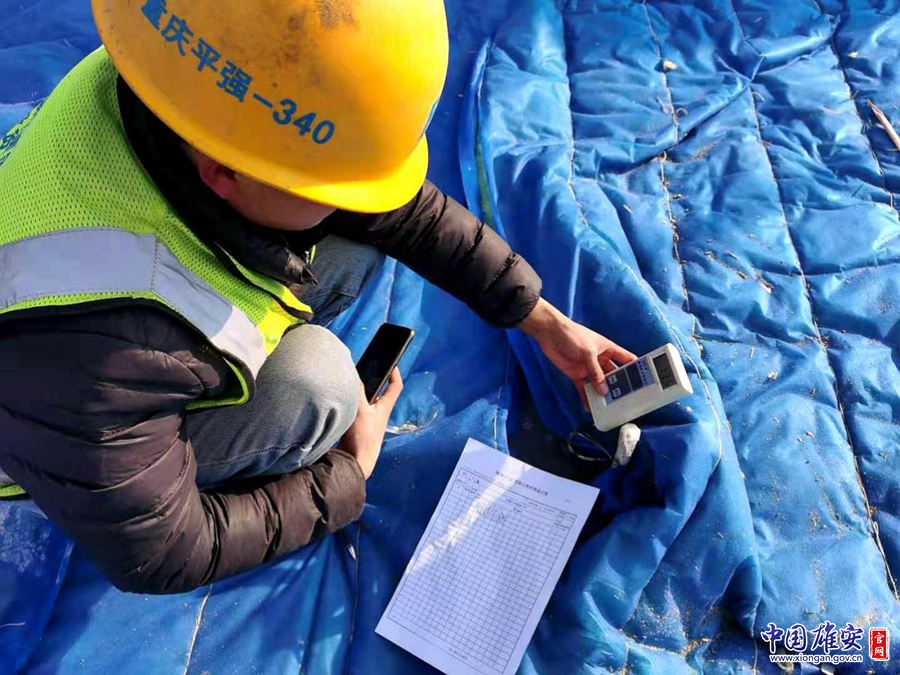 雄安商务服务中心二标段项目建设现场,建设者正在对混凝土浇筑点进行测温、养护和记录。中建八局供图