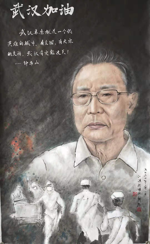 (郭江涛:疫情期间我在网上看到了许多白衣天使、抗击疫情的英雄人物图片,其中最打动我的是一位84岁老人一一钟南山。于是我用了两个昼夜的时间,创作了这副“钟老”含泪的作品。画到白衣天使紧张地奔跑急救病人时,我感觉到自己仿佛也是医疗队伍中的一员;画到“钟老”的表情时,我眼中满含泪花,80多岁的老人,不顾自己的身体救护病人。)