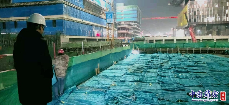 夜间气温骤降,雄安商务服务中心项目二标段建设工人给楼面板铺上棉被进行覆盖保暖。中建八局供图