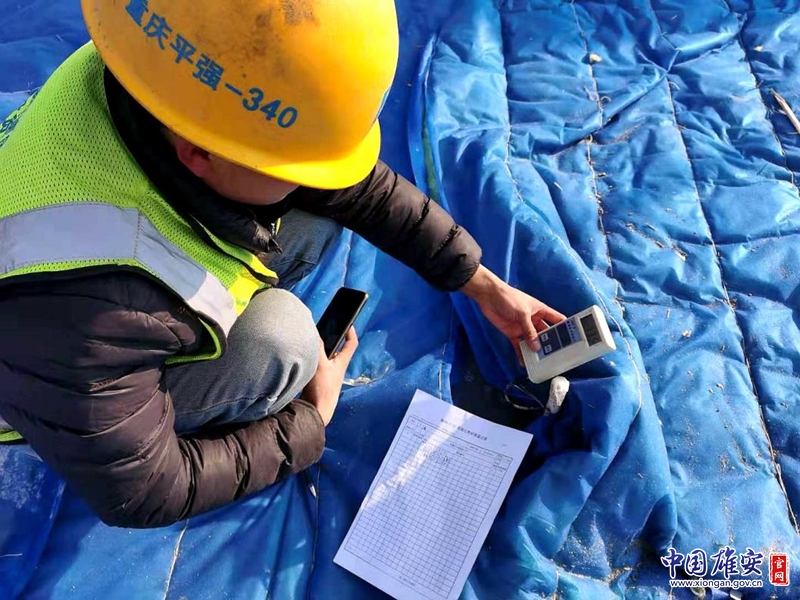 雄安商务服务中心项目二标段建设现场,建设工人对施工作业面进行测温。中建八局供图