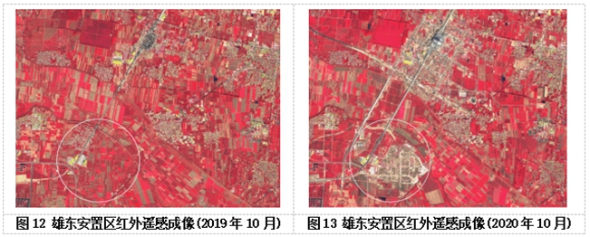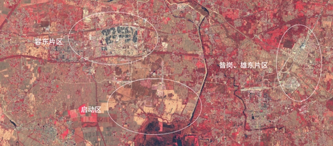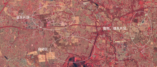 如图8-13所示,容东片区、雄安站枢纽片区、雄东安置区等重点建设区域的地表面貌变化非常显著。通过卫星遥感图像数据分析可以得到,容东片区在建区域的辐射面积比2019年10月增加了57.75%;雄安高铁站周边在建区域的辐射面积比2019年10月增加了69.48%;雄东安置区在建区域增加非常明显。随着各重点区域建设项目的不断推进,雄安新区城市组团的形态已见雏形,未来的城市面貌非常令人期待。