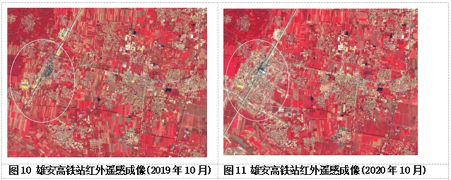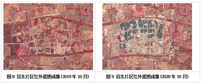 2020年雄安新区已全面转入大规模建设阶段,《报告》从多个角度展示了雄安新区2020年基础建设发展成效。如图6和图7所示,和2019年相比,雄安新区的整体地表面貌在2020年发生了显著变化。其中变化最为明显的,当属容东、昝岗、雄东、启动区等重点建设区域。通过对卫星遥感影像综合分析后可以得出,2020年10月雄安新区整体在建区域的辐射面积相比2019年10月增加了89.52%,建设规模显著扩大。