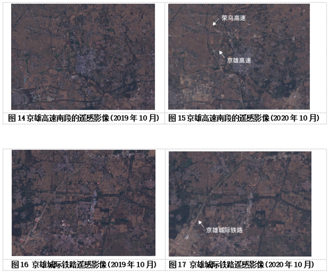 《报告》中呈现了交通基础设施建设对雄安新区地理面貌的影响。从图14、图15可以看到,荣乌高速和京雄高速以“南北纵横”的形态在遥感影像上清晰呈现,雄安新区的主干路网也已呈现出初步轮廓。此外,从图16、图17可以看到,京雄城际铁路已经全线贯通。2020年12月27日,雄安站正式投入使用,京雄城际铁路实现全线开通运营,进一步完善了京津冀城市群的高速铁路网结构。