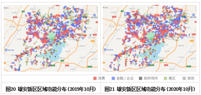 《报告》还深入研究了雄安新区产业空间的变化分布。基于聚类算法,通过融合人群到访的具体POI,可以计算出如图20和图21中所示的雄安新区各个区域主要功能分布。功能区的分布变化,可以折射出城市建设的速度以及区域产业格局的自我调整能力。过去一年,雄安金融和企业类功能区域增加了7.12%,消费类功能区域增加了27.34%,城市服务能力显著提升。功能区的转换也体现出雄安新区在快速发展建设过程中的自我调整能力。