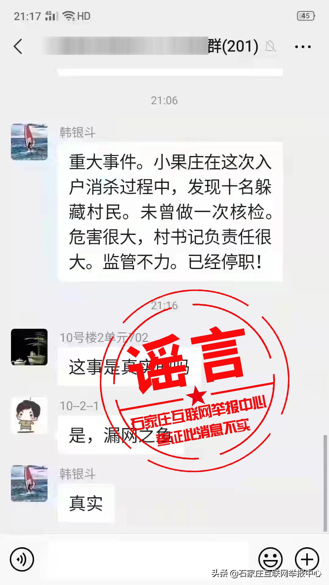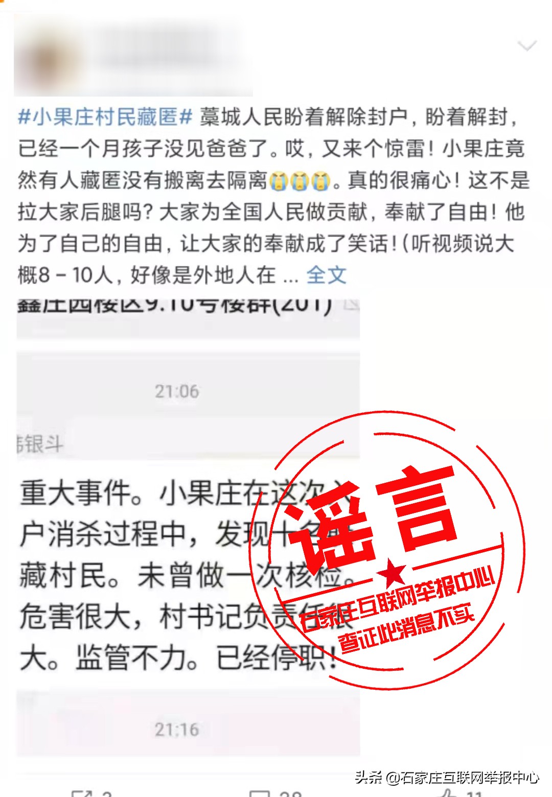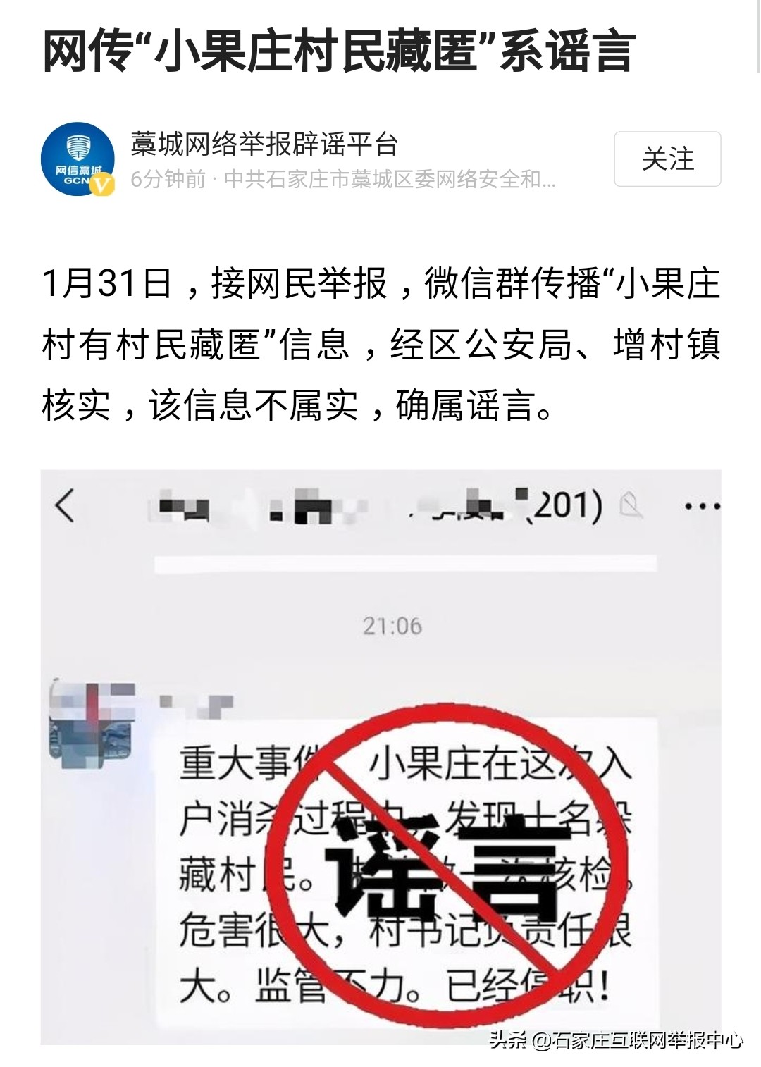 1月31日,微信群、微博等平台流传“小果庄村入户消杀过程中发现十多名藏匿村民,未做过核酸检测”的信息,经石家庄互联网举报中心核实,该消息为谣言,藁城区已通过“藁城网络举报辟谣平台”发布辟谣信息。石家庄互联网举报中心:网络不是法外之地,传播谣言、制造恐慌必将受到法律制裁,疫情当前,请广大网民不造谣、不传谣、不信谣,维护清朗网络空间。