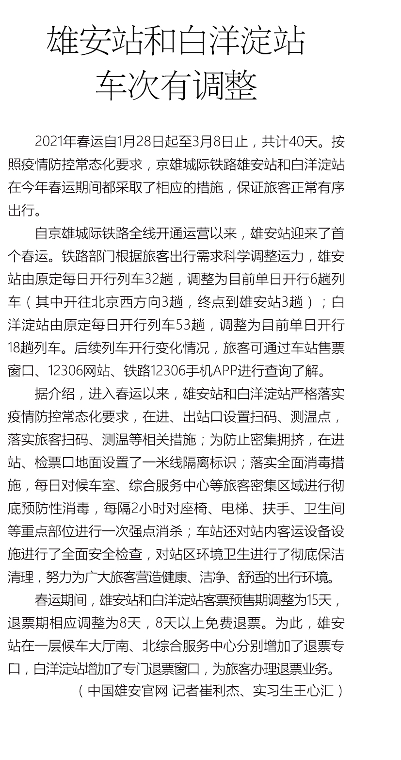 雄安站和白洋淀站客票预售期调整为15天,退票期相应调整为8天,8天以上免费退票。