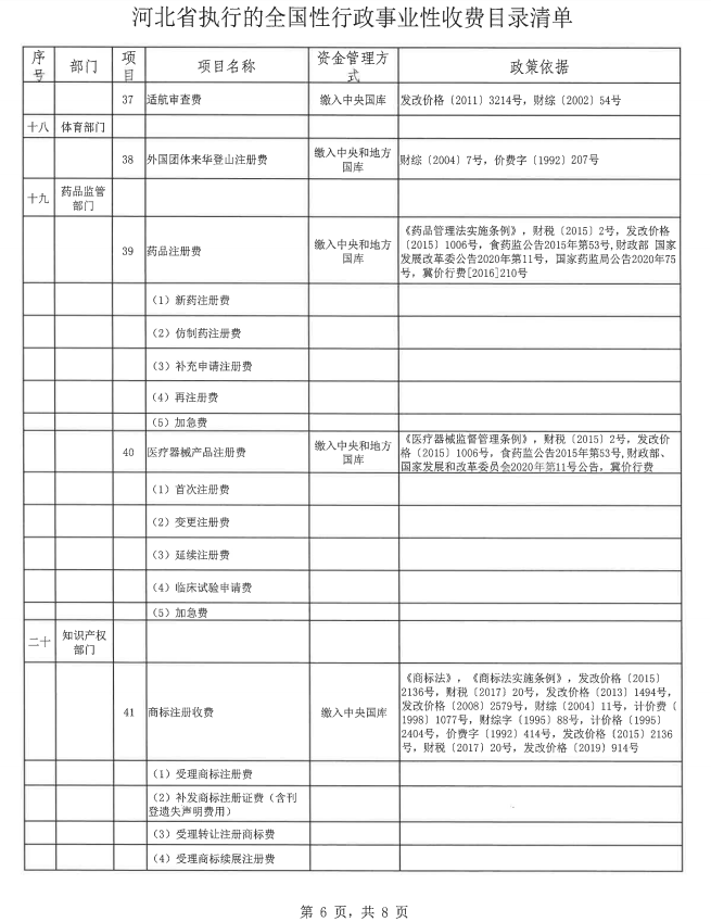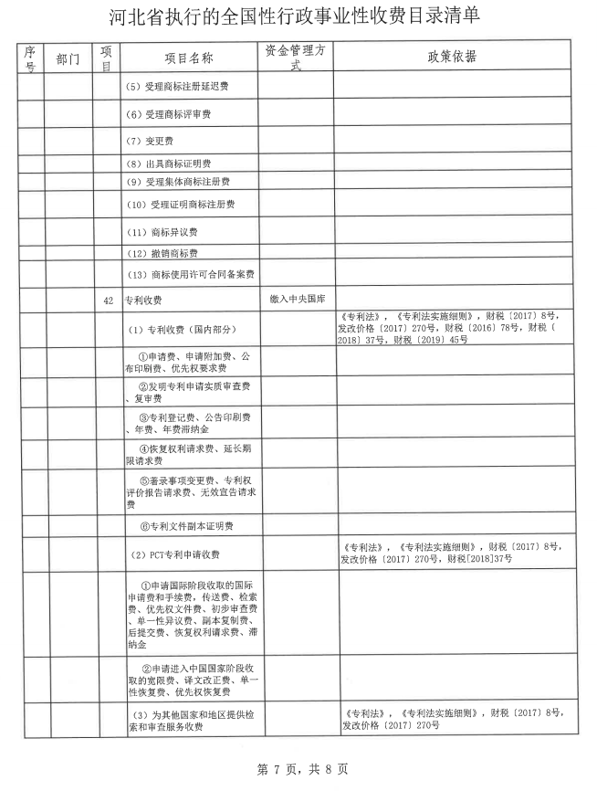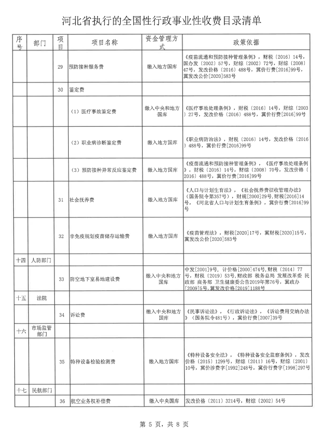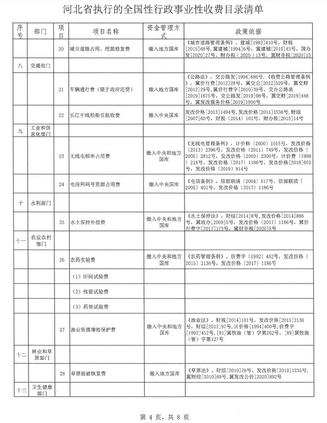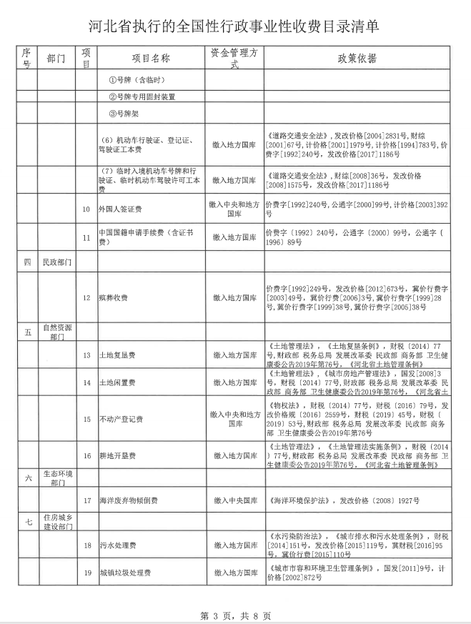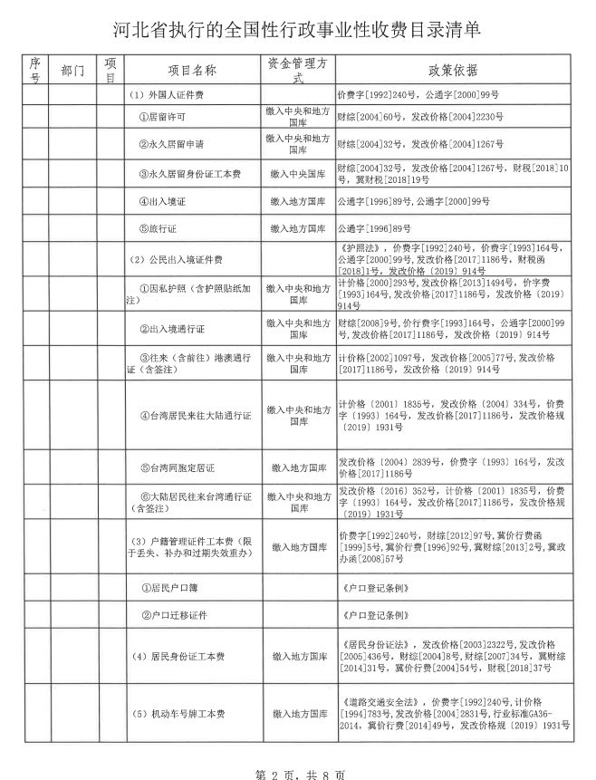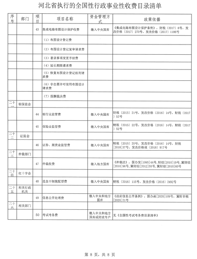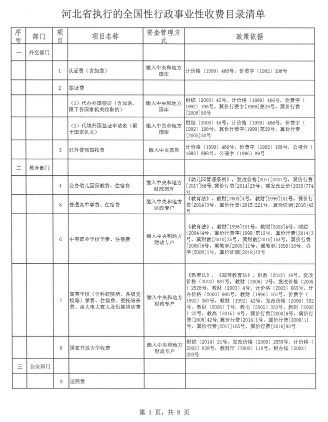 河北省执行的全国性行政事业性收费目录清单