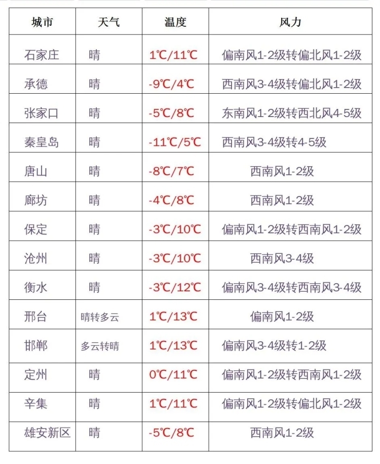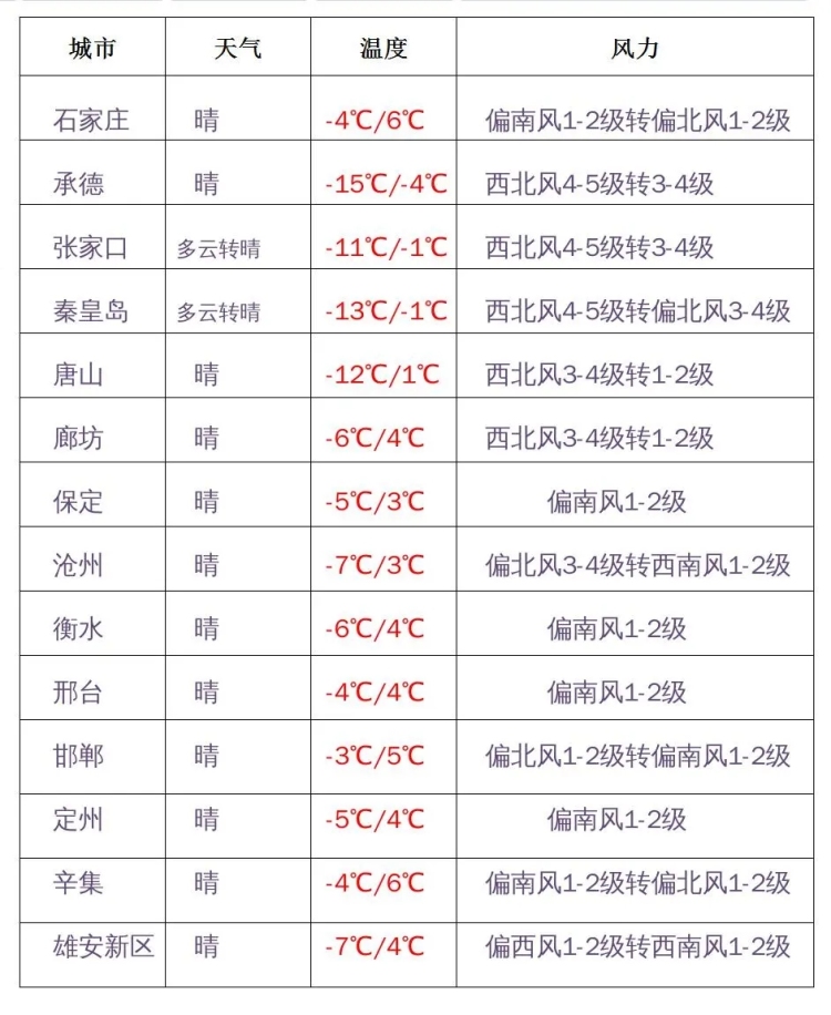 今天早晨,各地最低气温全部在-5℃以下,而北部地区以及沧州,还会跌破-10℃线。