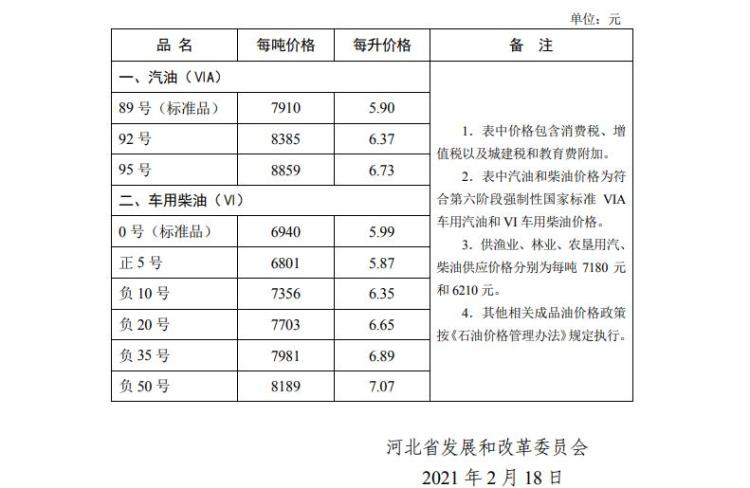 2月18日,河北省发展和改革委员会发布《关于调整我省成品油价格的公告》。根据现行成品油价格形成机制,自2021年2月18日24时起,河北省汽、柴油价格(标准品)每吨分别提高275元、265元,调整后的汽、柴油最高零售价格见下表。乙醇汽油价格按同标号汽油(VIA)价格执行,普通柴油价格按照同标号车用柴油(VI)价格执行,98号汽油价格由成品油生产经营企业根据市场情况自主制定具体价格。(河北日报记者潘文静)