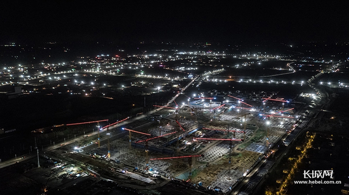 建设中的雄安新区容东片区夜景,昼夜不间断施工,塔吊灯与照明设备交相辉映,很是壮观。长城网记者刘潇 摄