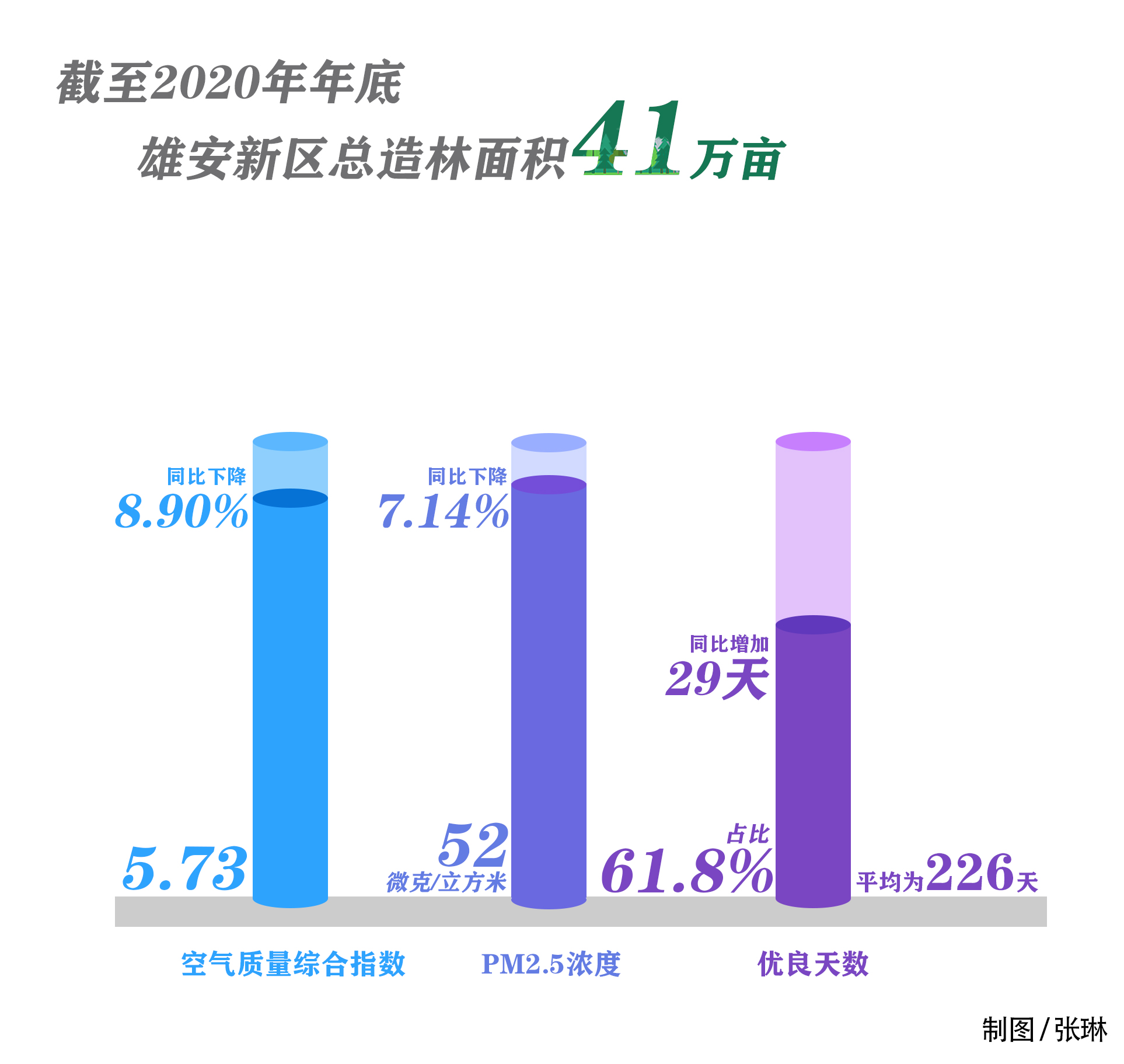 蓝绿交织、水城共融画卷扎实起笔。2017年秋季,河北雄安新区启动了以建立城市森林为目标的“千年秀林”工程。截至2020年年底,雄安新区总造林面积41万亩。空气质量明显改善。截至2020年12月31日,经初审雄安新区空气质量综合指数为5.73,同比下降8.90%;PM2.5浓度52微克/立方米,同比下降7.14%;优良天数平均为226天,占比61.8%,同比增加29天。