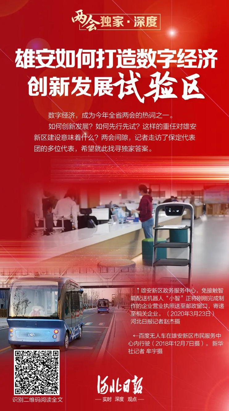 “数字经济是全球未来的发展方向。”在省人大代表、保定市市长郭建英看来,此次政府工作报告明确提出,“加快建设创新型河北、数字河北”“做大数字经济”的任务目标,为雄安新区加快发展数字经济提供了强有力的遵循和支撑,“雄安新区不可能孤立发展,它与保定乃至全省的发展息息相关。”