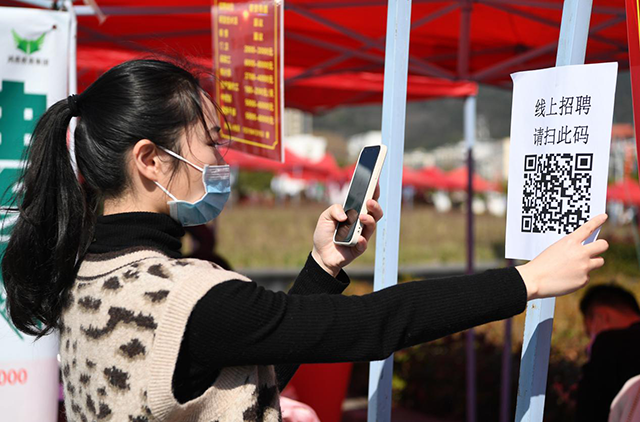 2月20日,求职者在扫描线上招聘信息的二维码。新华社记者万象 摄