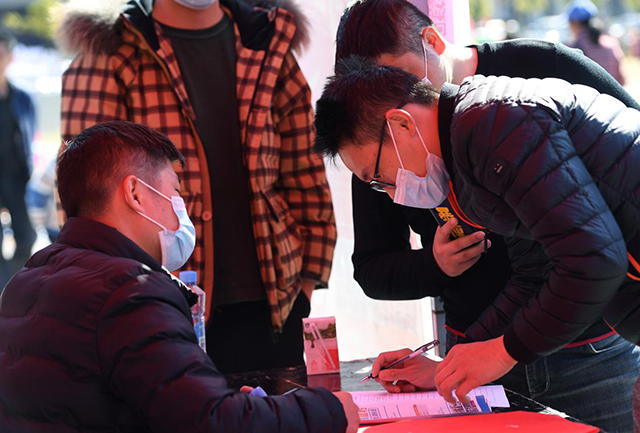 2月20日,求职者(右一)在招聘会上填写个人信息。新华社记者万象 摄
