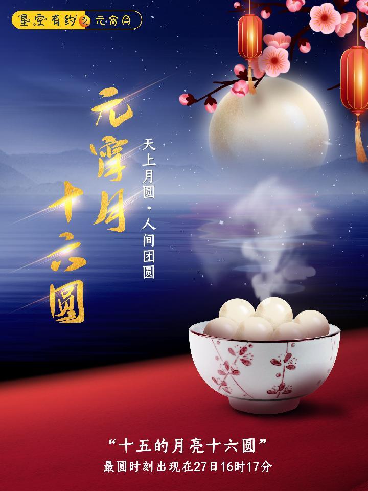 “虽然今年元宵节当晚的月亮并不是最圆的,但与正月十六的圆月相差无几。‘天上月圆,人间团圆’,正月十五当晚,一轮圆月升起时,人们边赏月,边畅谈,其乐融融,尽享合家欢。” 林愿说。