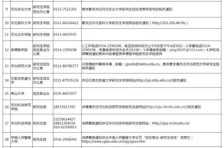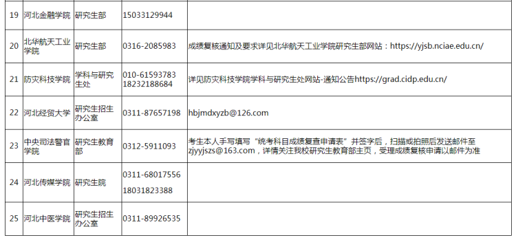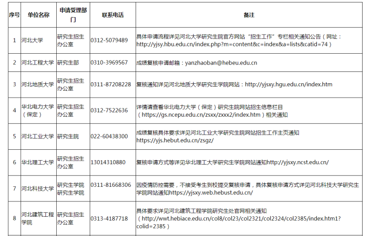 河北省2021年全国硕士研究生招生考试各招生单位成绩复核申请工作联系方式如下