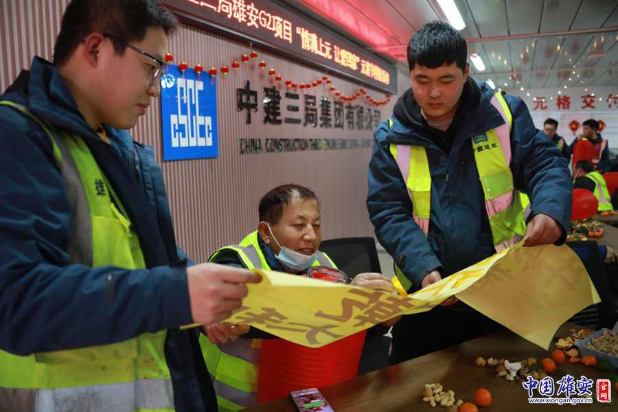 工友们帮助征迁群众工友贴上牛年愿望、祝福。中建三局刘淼 摄