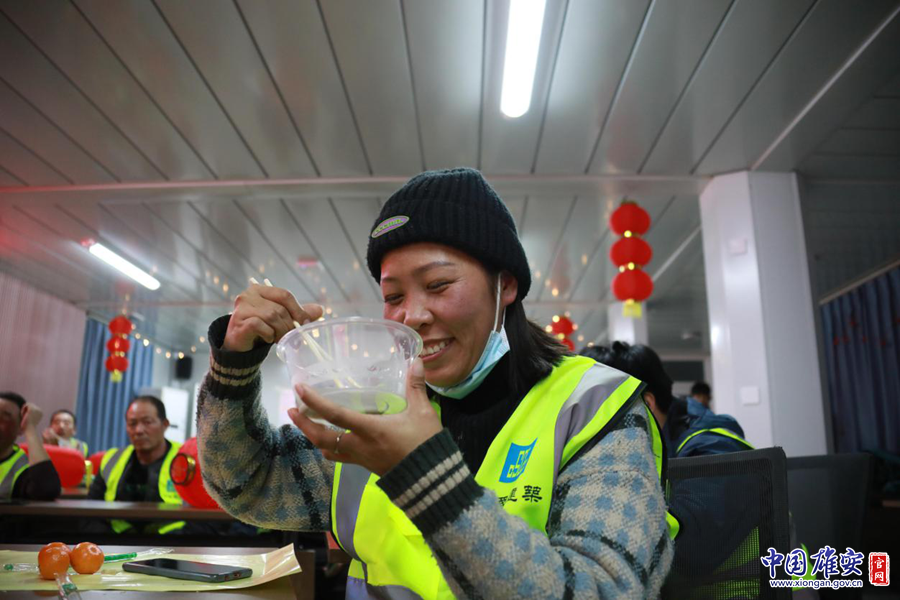 工友吃着自己煮的元宵,脸上露出了开心的笑容。中建三局刘淼 摄