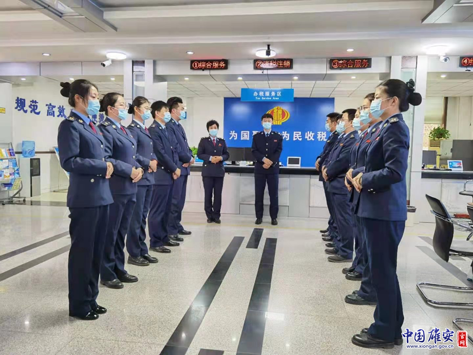 在办税服务厅内,工作人员进行服务规范化培训。雄安新区税务局供图