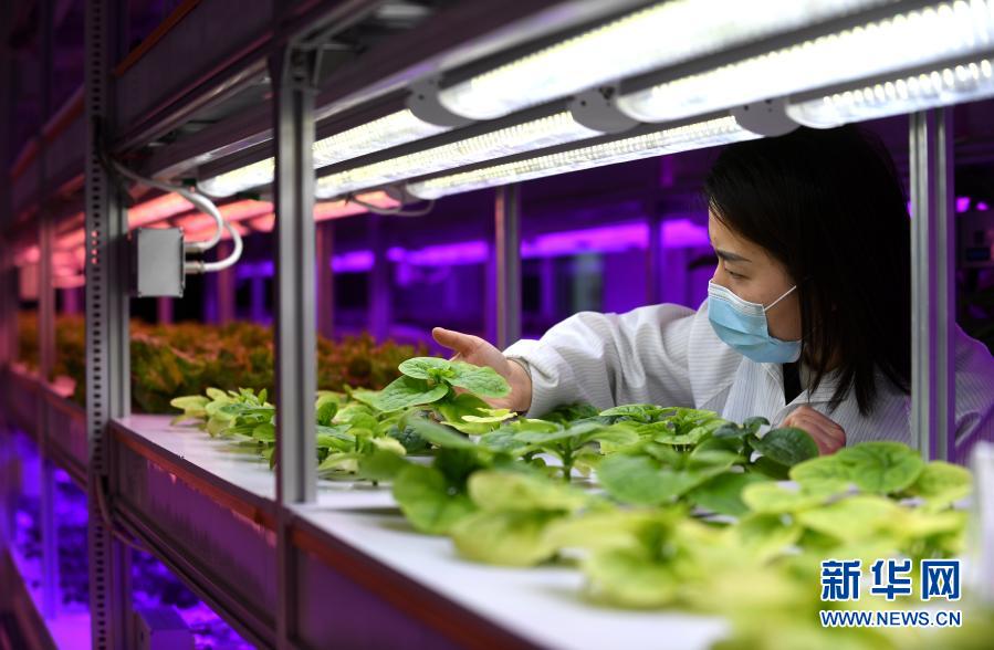 2月23日,在保定·中关村创新中心,工作人员检查在LED人工光照下蔬菜的生长状况。新华社记者王晓 摄