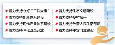 今年是实施“十四五”规划的开局之年,财政“钱袋子”怎么花?从省财政厅获悉,根据中央和省委省政府部署要求以及当前财经运行形势,我省将继续落实积极的财政政策,全力支持重大战略、重大政策、重大改革的有效实施,大事要事优先安排,重大部署全面落实,产业支持力度不减,民生政策应保尽保,积极推动河北高质量发展。