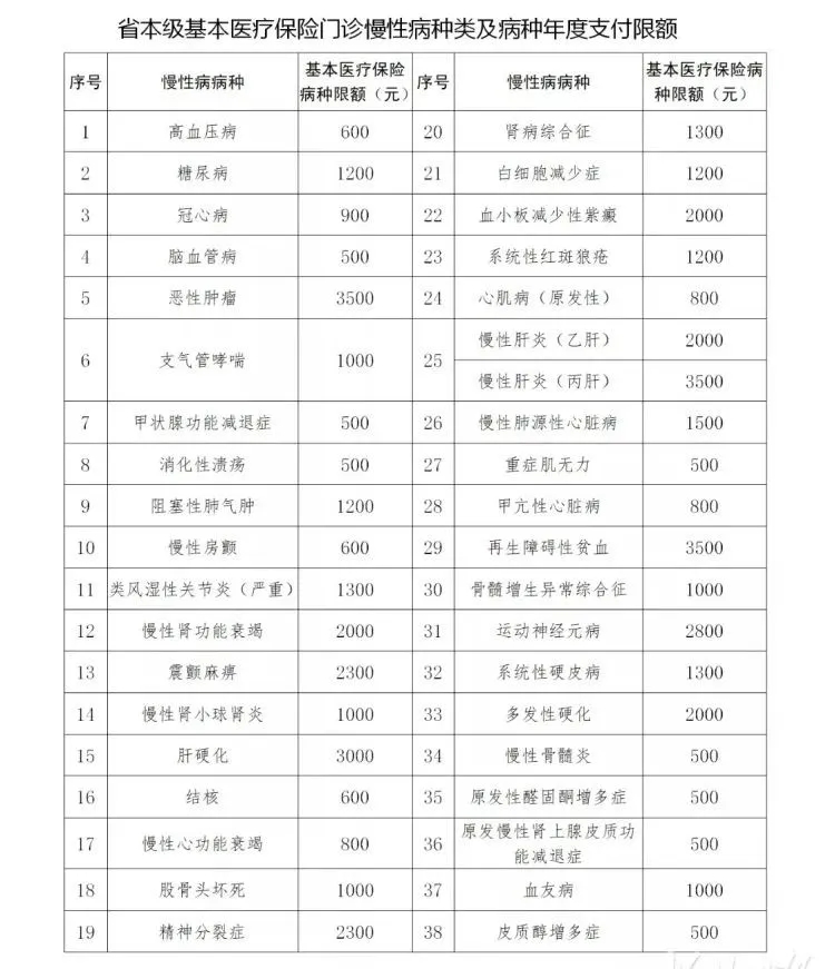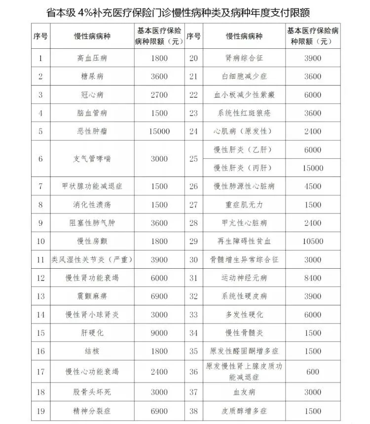 同时,省本级4%补充医疗保险参保人员门诊慢性病病种于2021年3月1日起调整为38种。新政策实施后,原9种慢性病不再受理申报认定,按原政策规定已认定9种慢性病的,继续保持原待遇不变;如在新政策病种范围内申报同类慢性病的,原待遇自动取消。