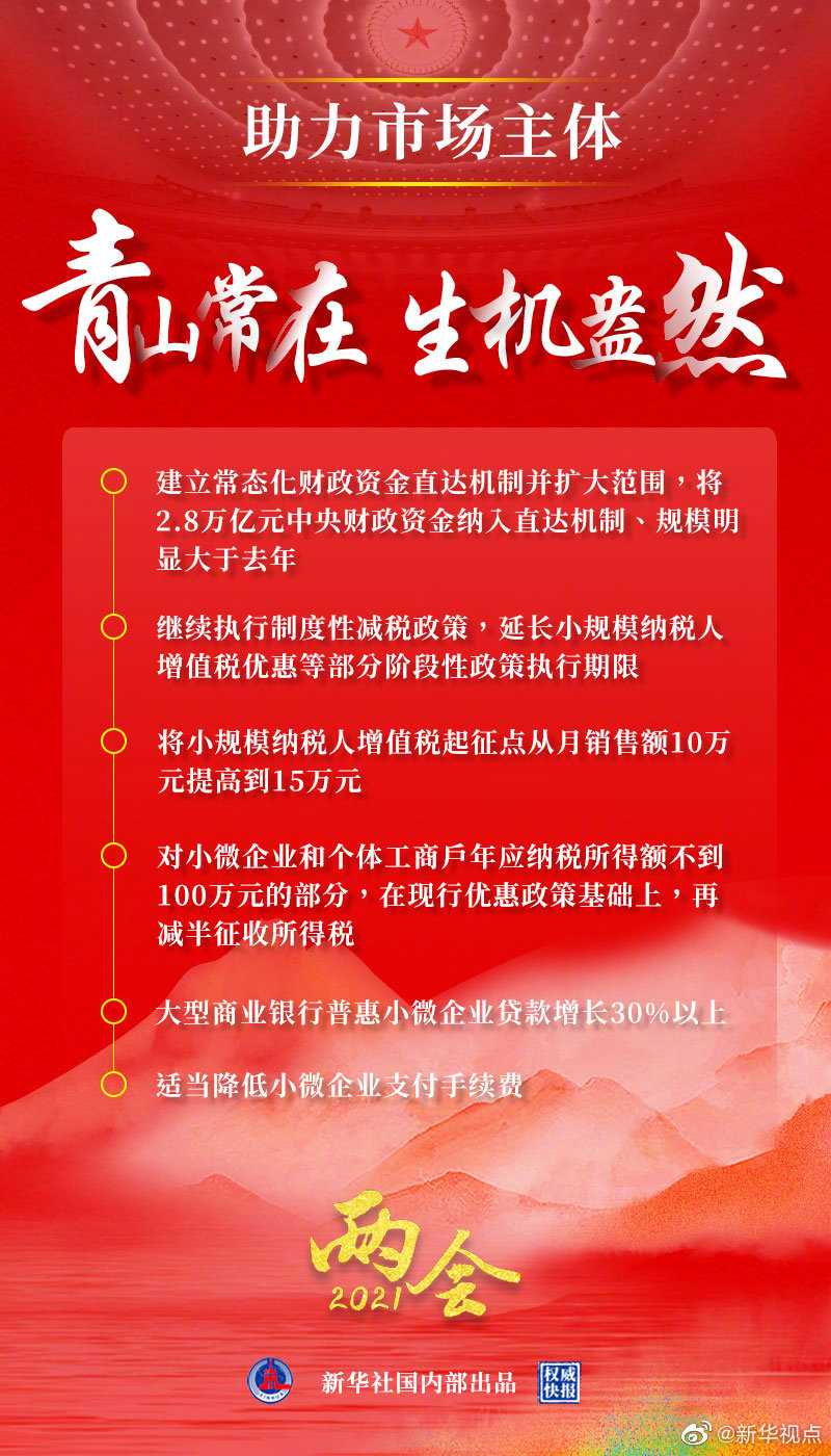 5日提请十三届全国人大四次会议审议的政府工作报告提出,加大对保就业保民生保市场主体的支持力度。建立常态化财政资金直达机制并扩大范围,将2.8万亿元中央财政资金纳入直达机制,规模明显大于去年;继续执行制度性减税政策,延长小规模纳税人增值税优惠等部分阶段性政策执行期限;将小规模纳税人增值税起征点从月销售额10万元提高到15万元。对小微企业和个体工商户年应纳税所得额不到100万元的部分,在现行优惠政策基础上,再减半征收所得税;大型商业银行普惠小微企业贷款增长30%以上;适当降低小微企业支付手续费。助力市场主体青山常在,生机盎然!(海报设计:张晨光)