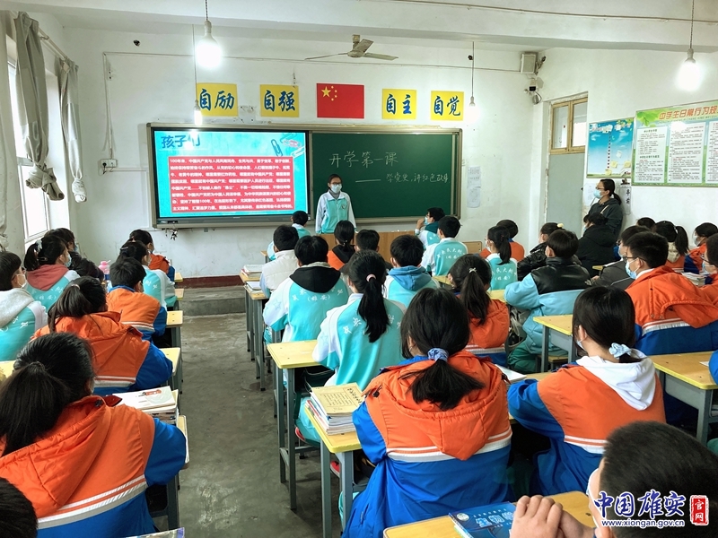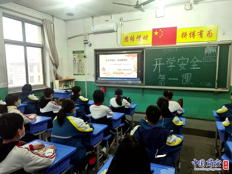 在雄县第一初级实验中学,全体学生同上“开学第一课”——集体观看了学校精心录制的微课视频《从数字看防疫》《扶贫攻坚战》,感受和学习无数共产党人为人民服务、舍身忘己的精神。同时该校还举行了以“心里有话向党说”为主题的宣传教育活动,让学生们明白学习党史的重要意义。