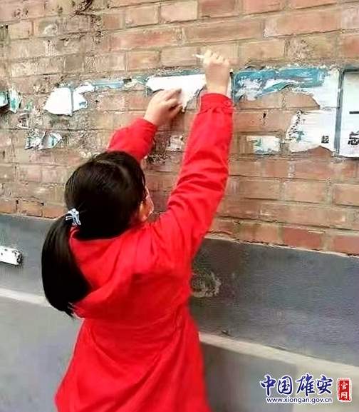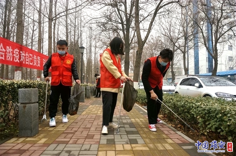 容城县青年志愿者在新容文化广场清理人行道垃圾。中国雄安官网记者黄海 摄