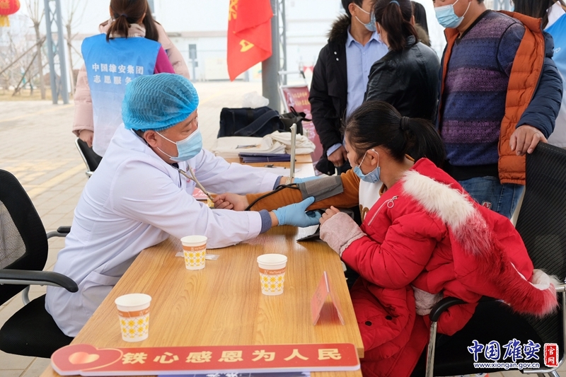 医务志愿者为建设者测量血压。中国雄安集团供图