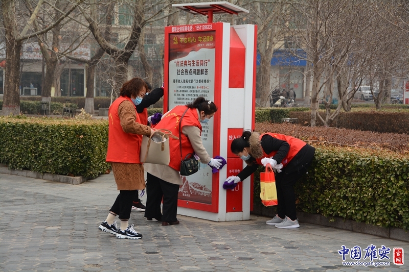 雄县志愿者擦拭街头公益广告栏。雄县志愿服务联合会供图