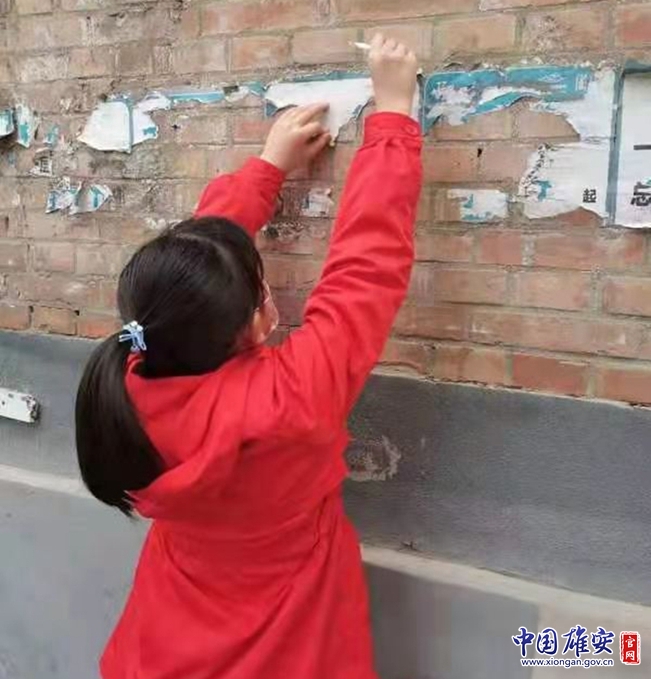 安新小学的学生在清理小广告。安新县委宣传部供图