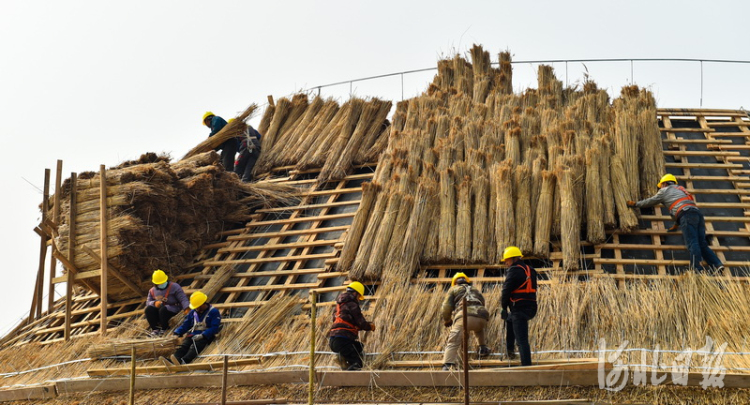 3月10日,施工人员们正在给白洋淀景区新建的生态科技展示馆和游客服务中心屋顶铺设芦苇。河北日报记者耿辉 摄