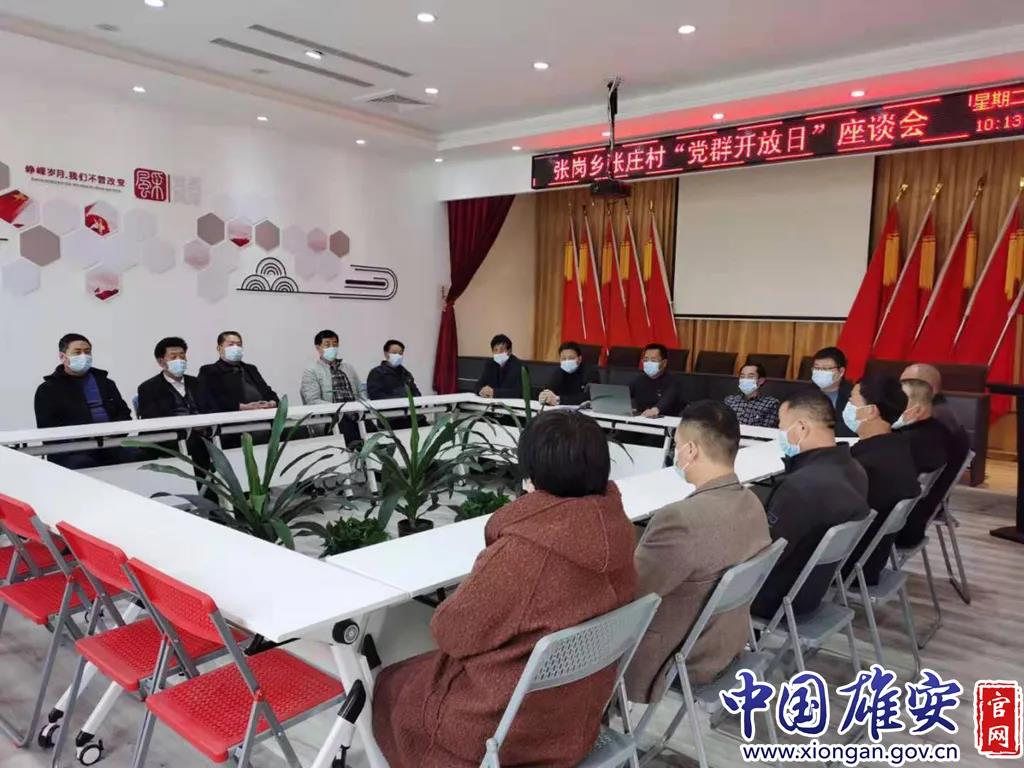3月9日上午,雄安新区雄县张岗乡张庄村党群服务中心内掌声阵阵、热闹非凡。村两委干部和党员群众围坐在会议桌前就村里正在开展的各项工作进行热烈讨论。经询问得知,张庄村正在开展“党群开放日”活动。