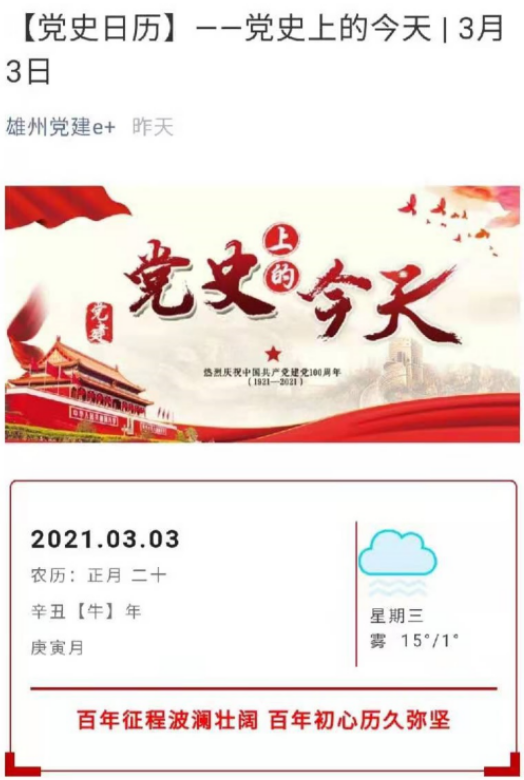 元旦假期过后,《雄州党建e+》成为大家津津乐道的微信公众号,原因是该微信公众号自元旦起推出了学党史专题“党史日历——党史上的今天”,以每天一篇微信公众号文章、一张党史日历卡片形式,展现中国共产党百年发展史中的重大活动、重大节日、重大事件、重要人物及中国共产党发展的光辉历程。