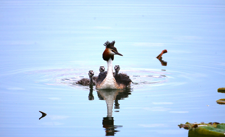 凤头䴙䴘生活在水塘中,不善飞行,以小鱼小虾和水草为食。特别善于潜水,捕鱼或者遇到危险的时候,常常会潜入水中,等你再次发现他时,已经到了很远很远的地方。