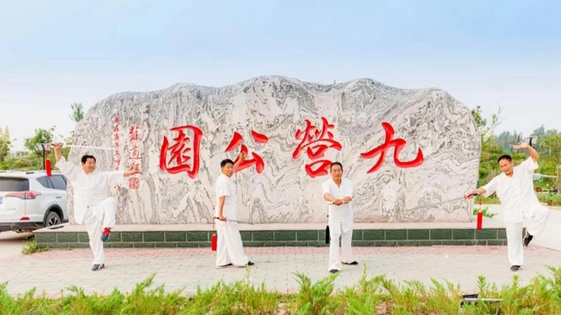 九营公园以“九营山”为特色。在公园建设过程中,大营镇充分利用雄安站建设施工弃土,堆积一座约15米高的土山。经过山体绿化,步道铺设,山坡及顶上种植白皮松、红柳、翠竹数百株,带状水渠横亘山北麓,白玉石桥跨水如虹,土山变“青山”。游人可拾级而上,至山顶石亭,一览八方景致。九营山南林地约50亩,种植法桐、樱花、海棠、五角枫、千头椿、紫薇、木槿、白蜡、榆叶梅、红枫等乔木3000余株;玫瑰、女贞、卫矛、冬青等灌木40000余株。林中设计的步行小径,可供游人在“天然氧吧”中散步养身。九营山东麓建有文化广场,依托新时代文明实践所,设宣传栏展示大营镇非物质文化遗产。漫步九营公园,除了苍松翠竹、凉亭美景,还可以看到山坡上、步道旁精心打造的党建主题景观,二十余块党建文化展示牌生动再现红色文化、中国精神,包括西柏坡精神、五四精神、红船精神、井冈山精神等,在游览中重温党史,感受红色氛围。