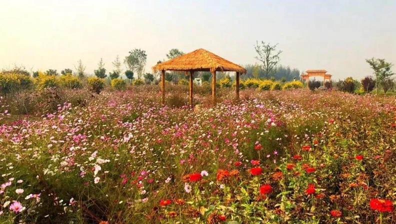 北沙口乡花海主题公园的整个花海由金鸡菊、黑心菊和百日草组成。在这里,春天可以欣赏到山茶花、山桃花、金鸡菊,夏天可以看到五彩石竹,秋天则是百日草、波斯菊,冬天还有白皮松。公园绿化系统依托现有地形,按照“一轴、一带两区”的布局方式,设置有生物认知园、自然通廊等场地设施,还有健身器材、科普长廊,是以休闲、运动、科普为一体的综合公园。