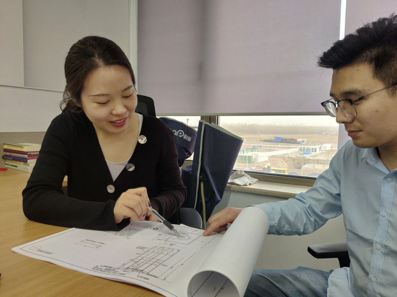 ↑王园园(左)和同事讨论工程方案。(采访单位供图)