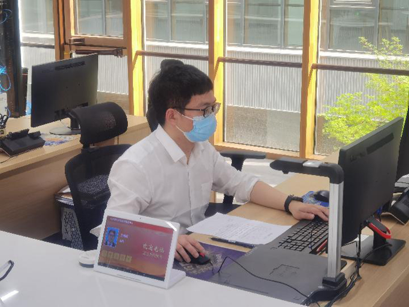 ↑王旭航在雄安政务服务大厅“您说我改”窗口,处理企业群众的意见建议。(采访单位供图)