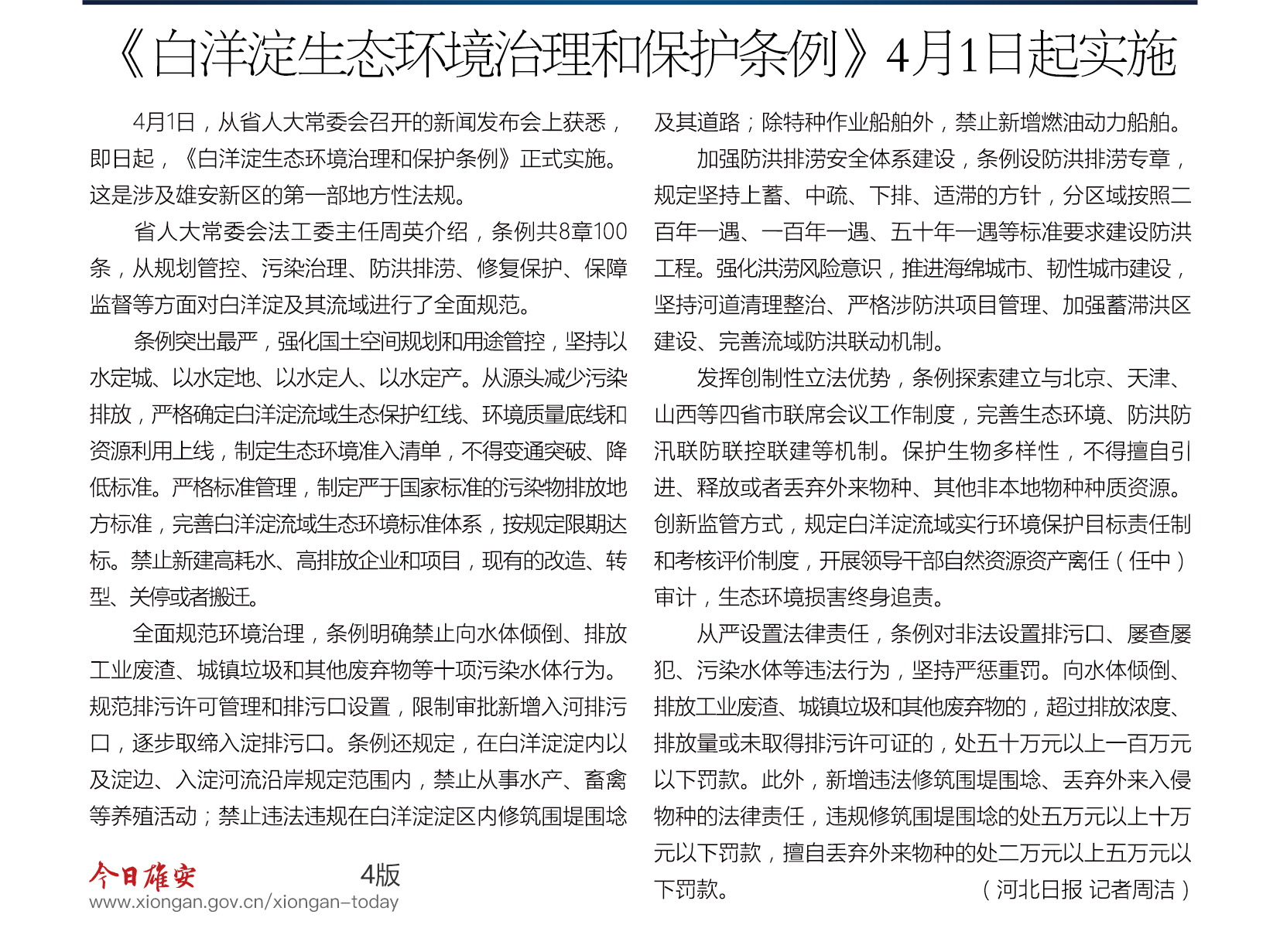 《白洋淀生态环境治理和保护条例》4月1日起实施
