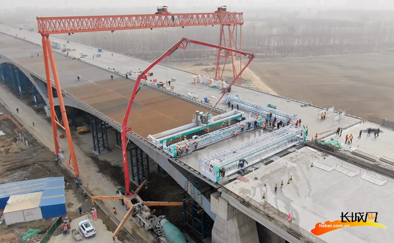 京雄高速作为雄安新区对外骨干路网的“头号工程”,如今已经进入“决战决胜”阶段。在白沟河特大桥施工现场,随处可见弯腰屈背、埋头苦干的身影,运输钢筋材料、进行栓钉焊接、绑扎钢筋网......320余名施工人员聚力攻坚,只为桥面混凝土铺装作业能够顺利进行。该桥副总工王宝辉介绍,白沟河特大桥是北京进出雄安新区的门户桥梁,建成后将成为我国规模最大的上承式钢箱连拱桥。目前,包括白沟河特大桥在内的京雄高速河北段主体工程已全部完工,为2021年上半年全线建成通车奠定坚实基础。