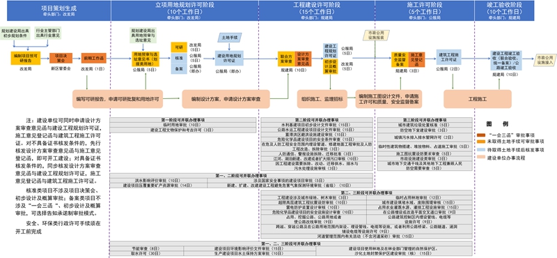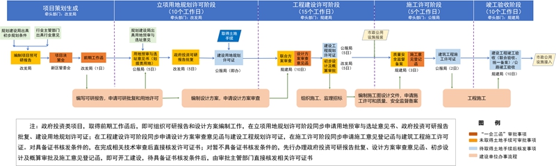 大力整合、精简审批环节和事项,实现工程建设项目审批统一标准化管理。以数字化驱动新区工程建设项目审批工作,实现全流程全环节“线上受理、线上审批、线上监管”。以“部门联动、主动服务”为基础,推进实施建设项目集中审批,完善帮办代办机制,全面推进审批服务“马上办、网上办、全帮办”,不断提升投资项目审批工作效率和服务水平。以“宜证则证、容缺受理、函证结合”为原则,形成法定许可和“一会三函”并联运行、同时审批的完整审批链条,实现政府投资类项目从项目立项到施工许可审批时限控制在30个工作日内,企业投资核准类项目从项目立项到准予开工建设审批时限控制在14个工作日内,企业投资备案类项目“拿地即开工”。