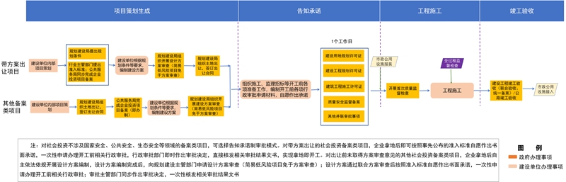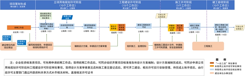 工程建设项目审批流程主要分为立项用地规划许可、工程建设许可、施工许可和竣工验收四个阶段,在项目立项前期加强项目策划生成,实行阶段内事项“并联审批、限时办结”。在此基础上,将其他行政服务、技术审查、强制性评估、中介服务、市政公用服务等事项纳入相关阶段办理或并行推进。在每一阶段,建设单位“一窗式”申报阶段审批事项、领取相关审批文件。