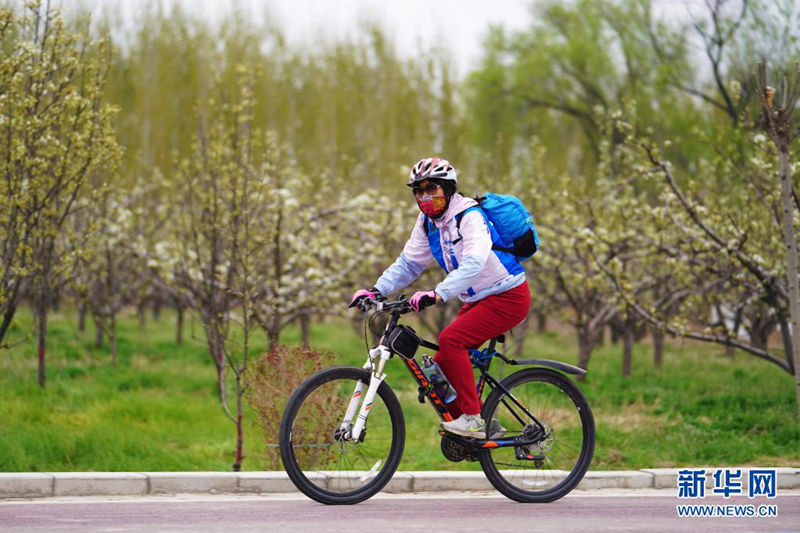 4月5日,游客在雄安新区雄县雄州镇的梨园骑行。