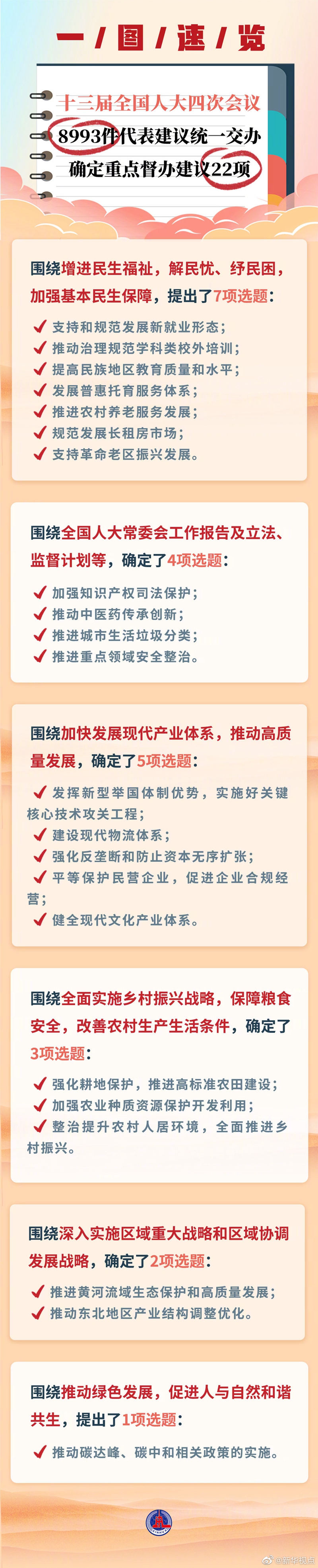 在认真分析代表建议并广泛征求意见基础上,全国人大常委会办公厅确定了22项重点督办建议,涉及代表建议300多件:围绕增进民生福祉,解民忧、纾民困,加强基本民生保障,提出了7项选题;围绕全国人大常委会工作报告及立法、监督计划等,确定了4项选题;围绕加快发展现代产业体系,推动高质量发展,确定了5项选题;围绕全面实施乡村振兴战略,保障粮食安全,改善农村生产生活条件,确定了3项选题;围绕深入实施区域重大战略和区域协调发展战略,确定了2项选题;围绕推动绿色发展,促进人与自然和谐共生,提出了1项选题。