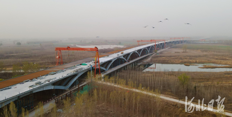 4月1日,喷薄而出的红日映照在建设中的京雄高速公路白沟河特大桥上,17孔钢箱梁连拱支撑起宽阔平坦的路面,一路向南通往雄安新区。