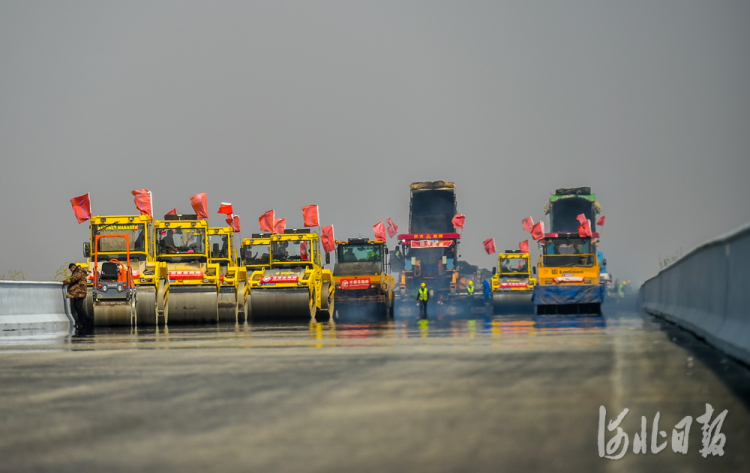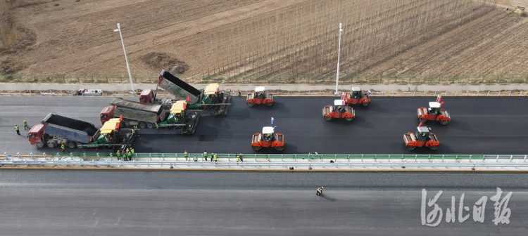 京雄高速(河北段)施工现场,工人们正在进行路面摊铺。